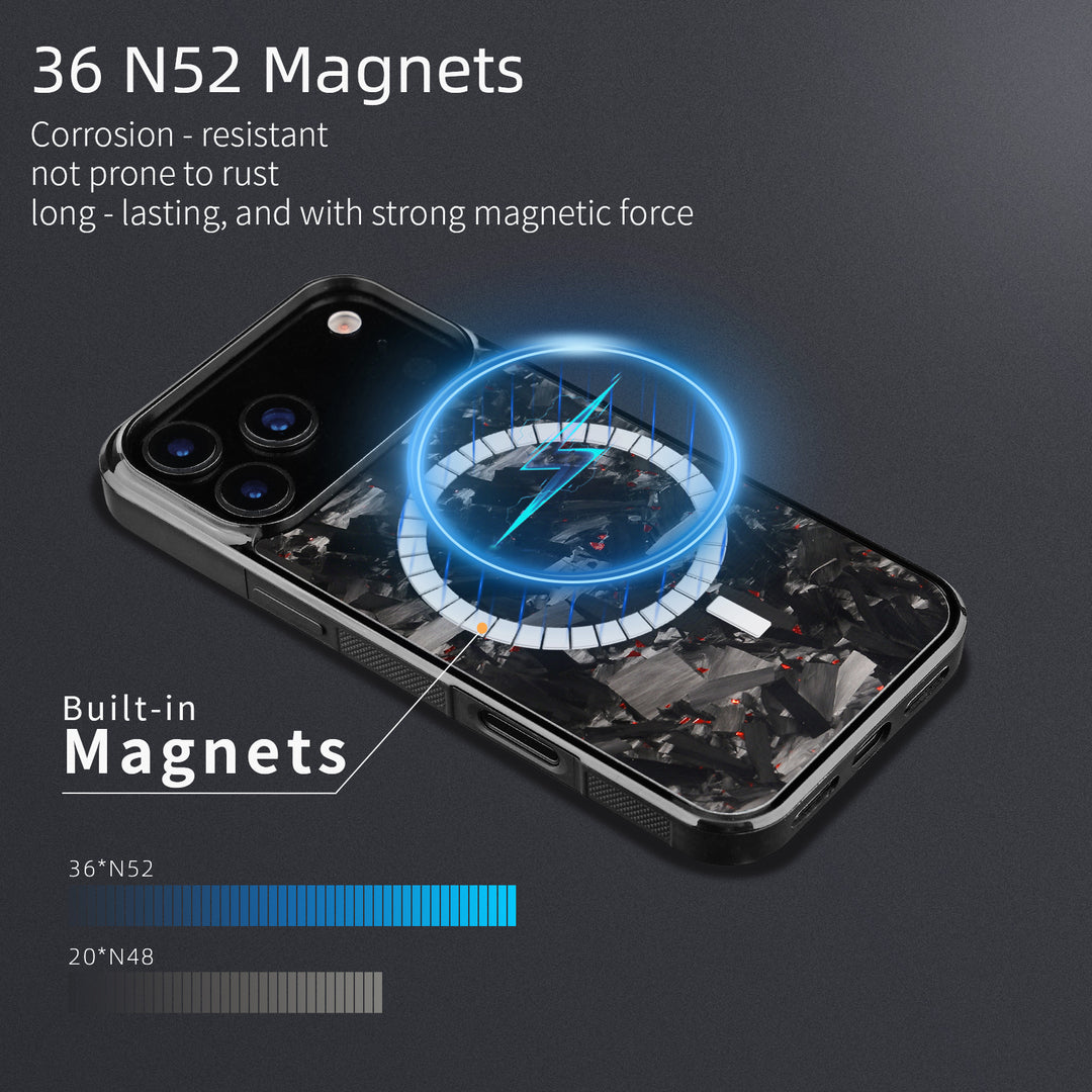 Experience luxury with the Carbon Fiber MagCase, featuring an authentic forged carbon fiber finish that glistens with elegance. Designed for MagSafe compatibility, it offers a secure magnetic connection for effortless wireless charging and accessories.