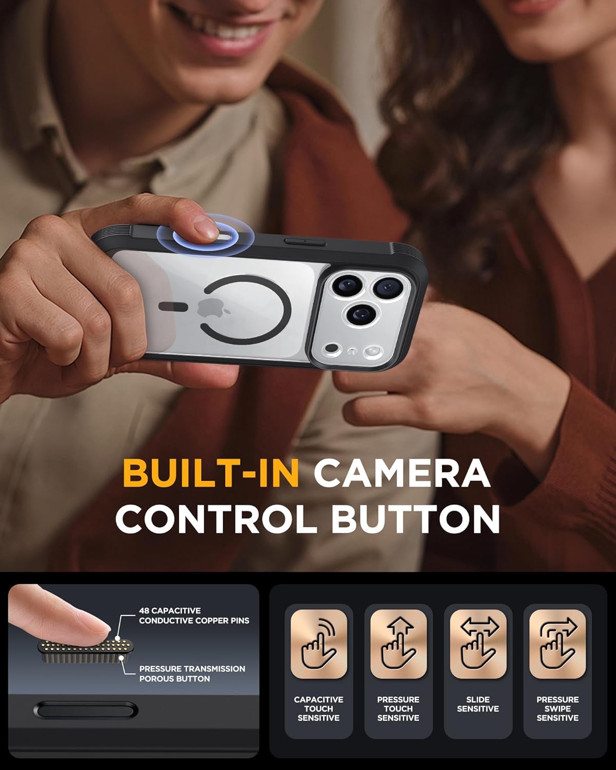 Engineered with dual-layer military-grade materials, this case has passed 8,000+ drop tests, delivering uncompromising 360° full-body protection. Unlike other cases with exposed cutouts, ’s exclusive camera control design safeguards your lenses without affecting photo quality, preserving the original camera experience while providing a secure and comfortable grip.